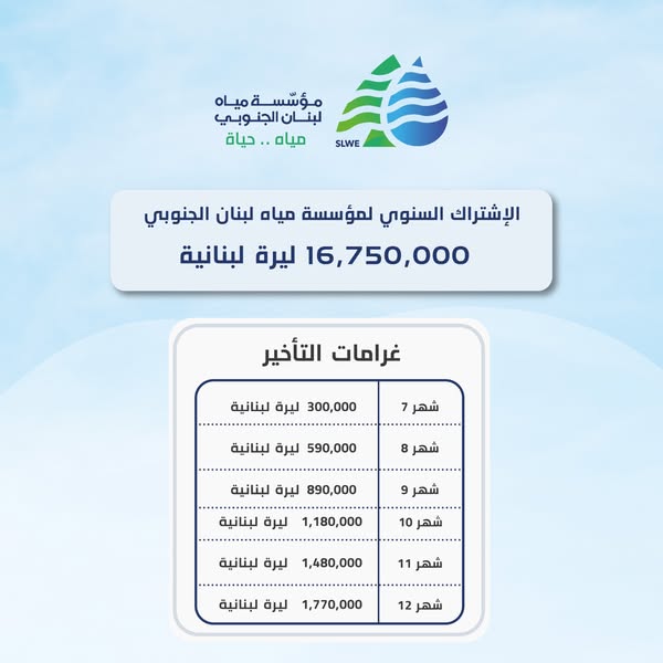 الاشتراك السنوي لمؤسسة مياه لبنان الجنوبي عن عام 2025 هو 16750000