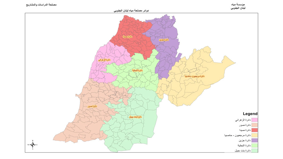 تغطي المؤسسة مساحة جغرافية تقارب 2130 كلم2، وهي مقسمة إلى سبعة دوائر: صيدا، الزهراني، النبطية، صور، بنت جبيل، جزين، و مرجعيون/حاصبيا.